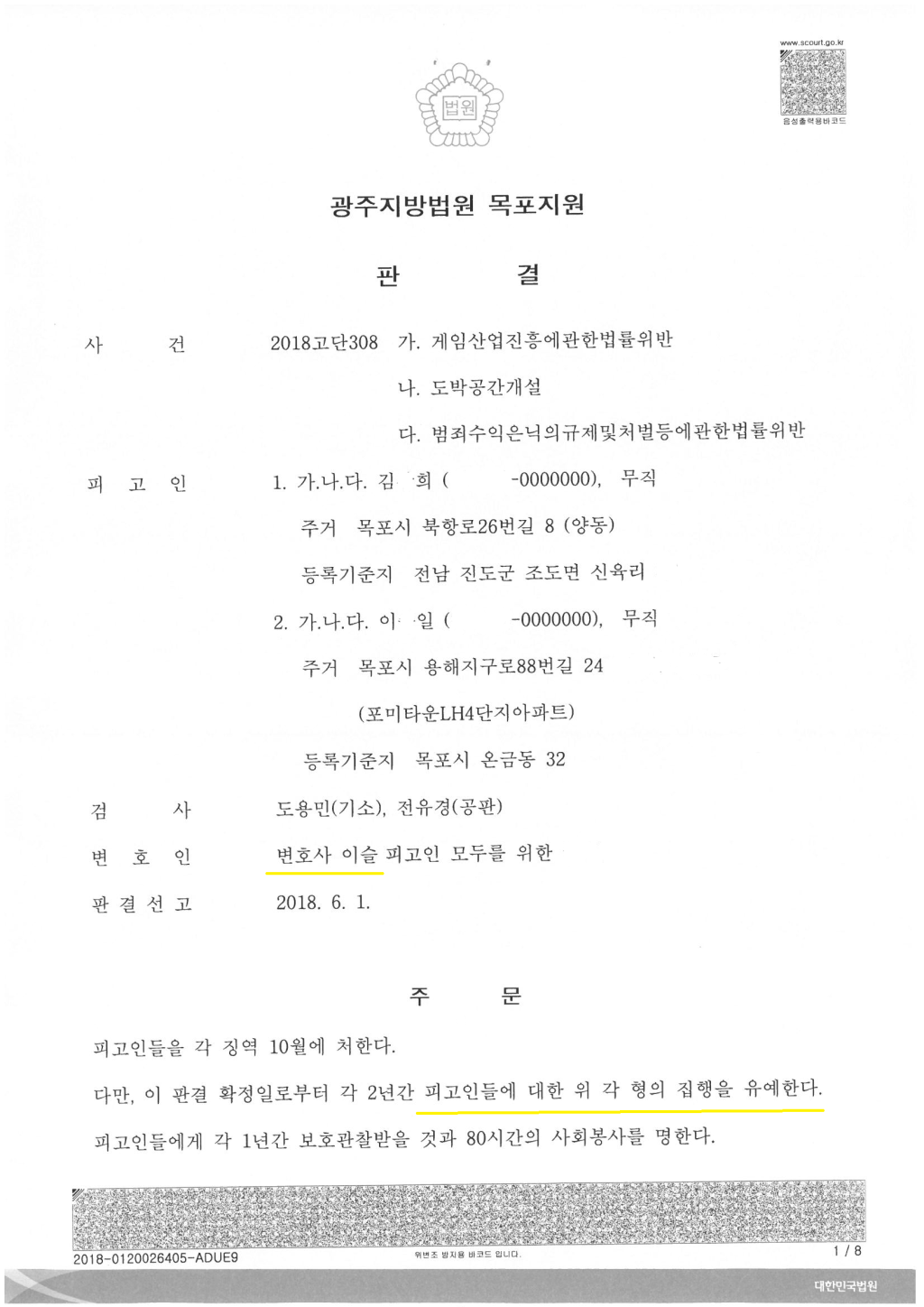 [이슬 변호사] 게임산업진흥에관한법률위반, 도박공간개설, 범죄수익은닉의규제및처벌등에관한법률위반 집행유예